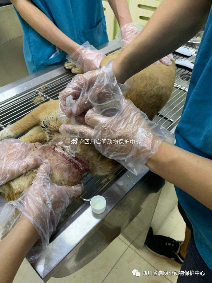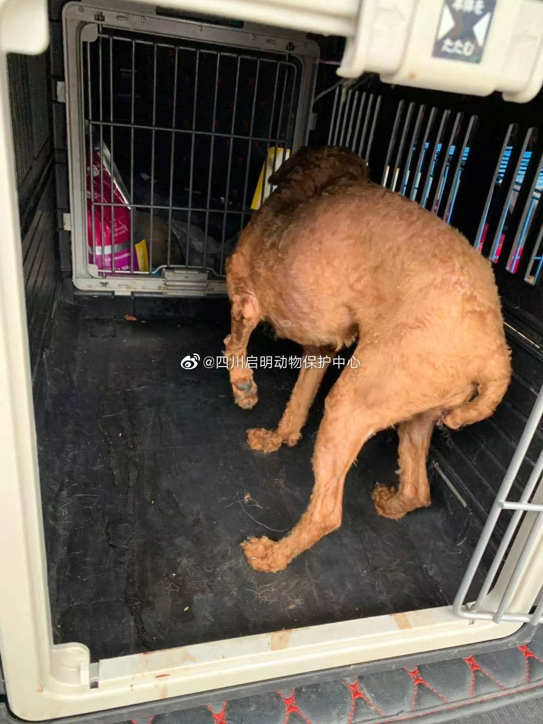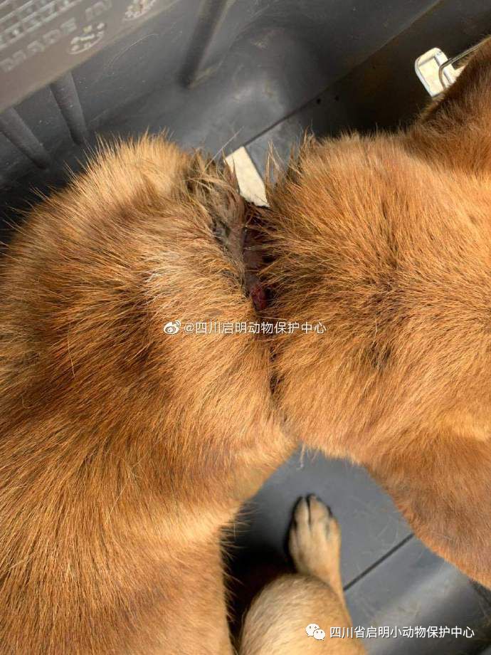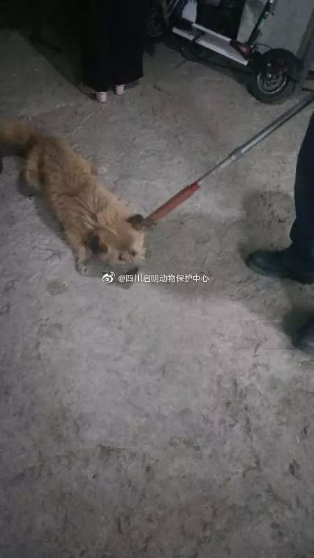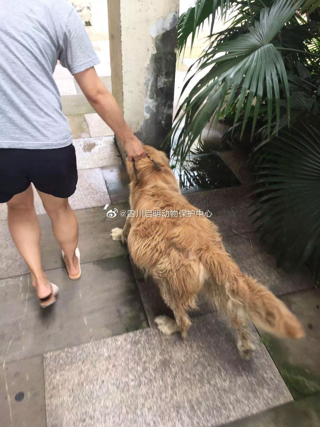 这是启明工作人员在龙泉驿区彩艺艺术学校附近救助的一只成年金毛犬,狗狗腹部肿大,现场救助人员不能判断是肿瘤还是腹水,现在已送往定点医院进行诊治。