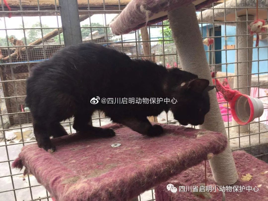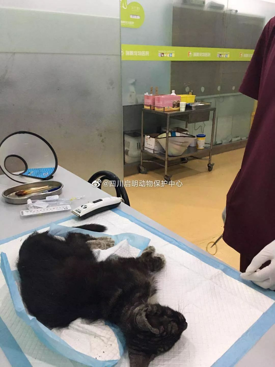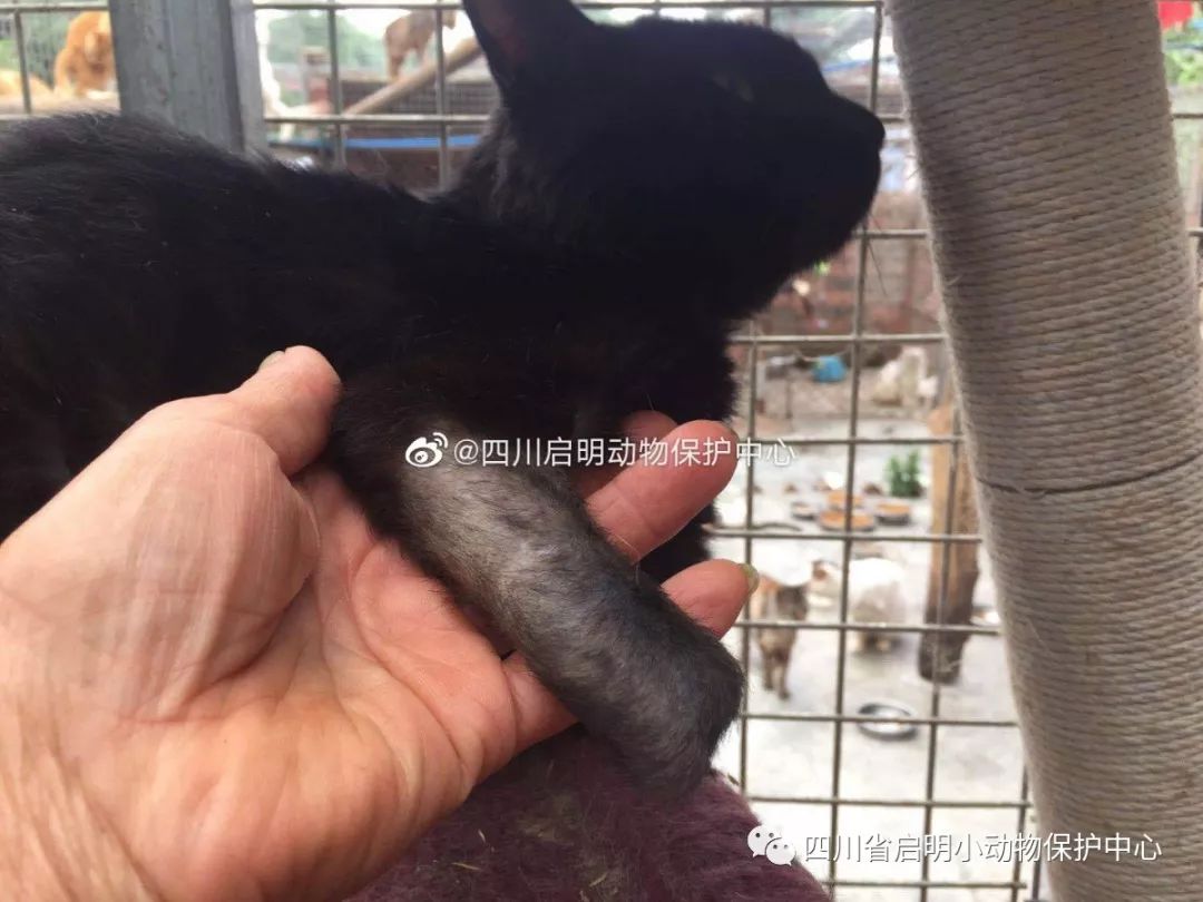 这是在红牌楼附近救助的带有皮肤病并且被车撞的黑色猫咪,目前已经送往基地定点博爱动物医院治疗。