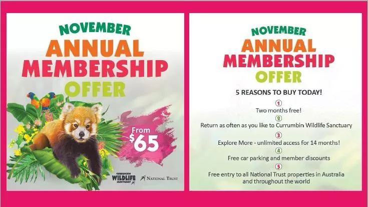 可伦宾野生动物保护园本月(11月)正在推出一个限时版的会员促销,这个促销活动将给新加入会员额外的两个月免费! 仅限2019年11月1日-30日加入的新会员。大家可以通过官网、电话及公园现场购买办理入会。鉴于从2019年12月1日起会员价格将会上涨,强烈建议您的家人及朋友在价格上涨之前加入会员计划并抢先享受会员的各大优惠: