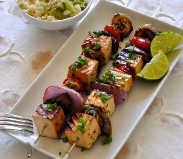 2、用烤签将豆腐、蘑菇、彩椒串起来,并涂上一层酱汁。