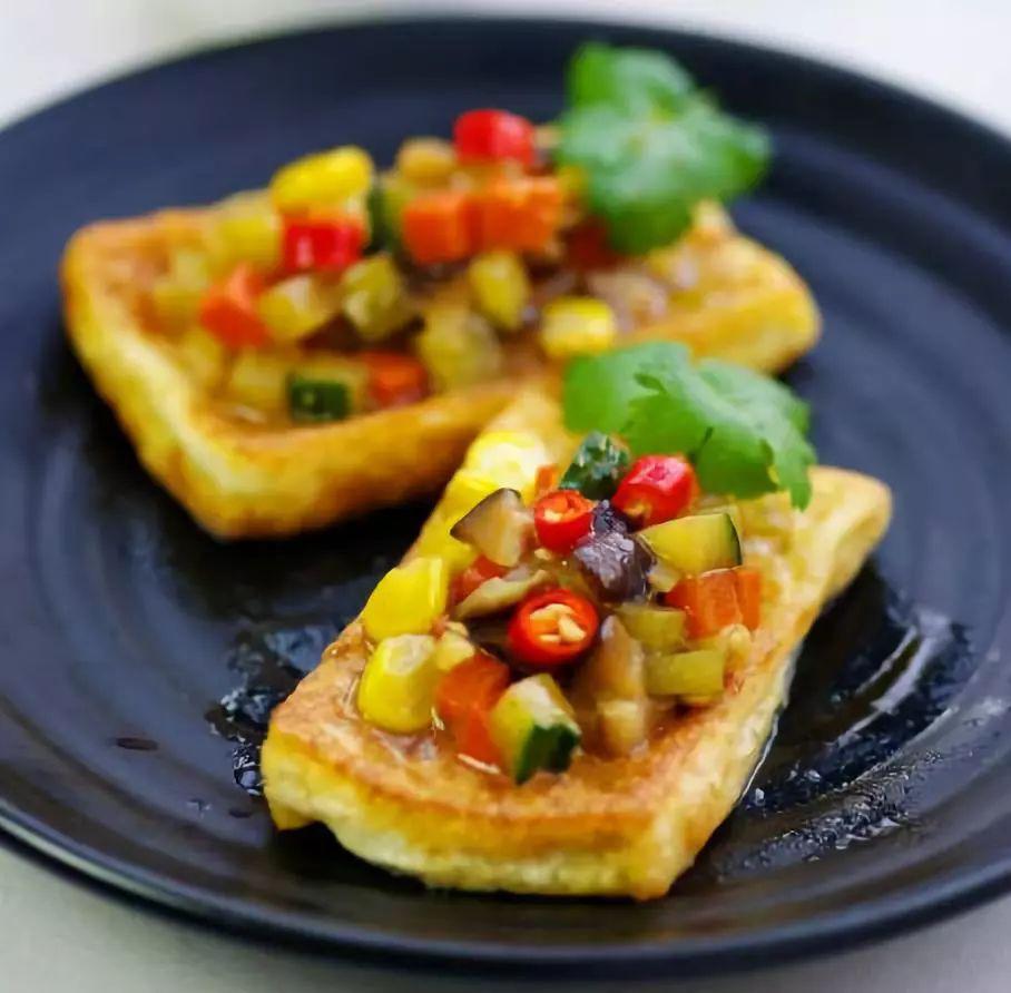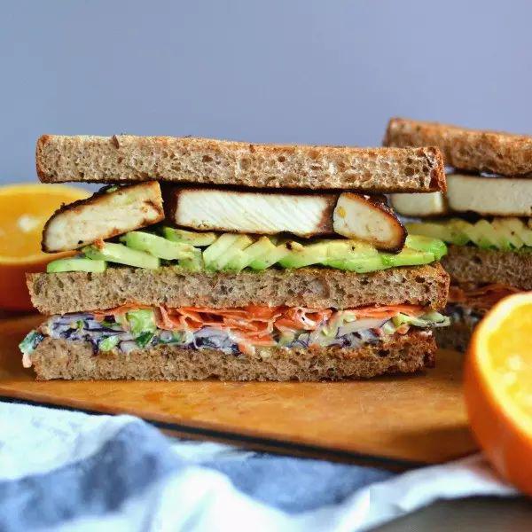 先把豆腐的表皮煎得脆脆的。然后,把煎好的豆腐、蔬菜和牛油果一起夹在吐司里面,就可以开动啦。