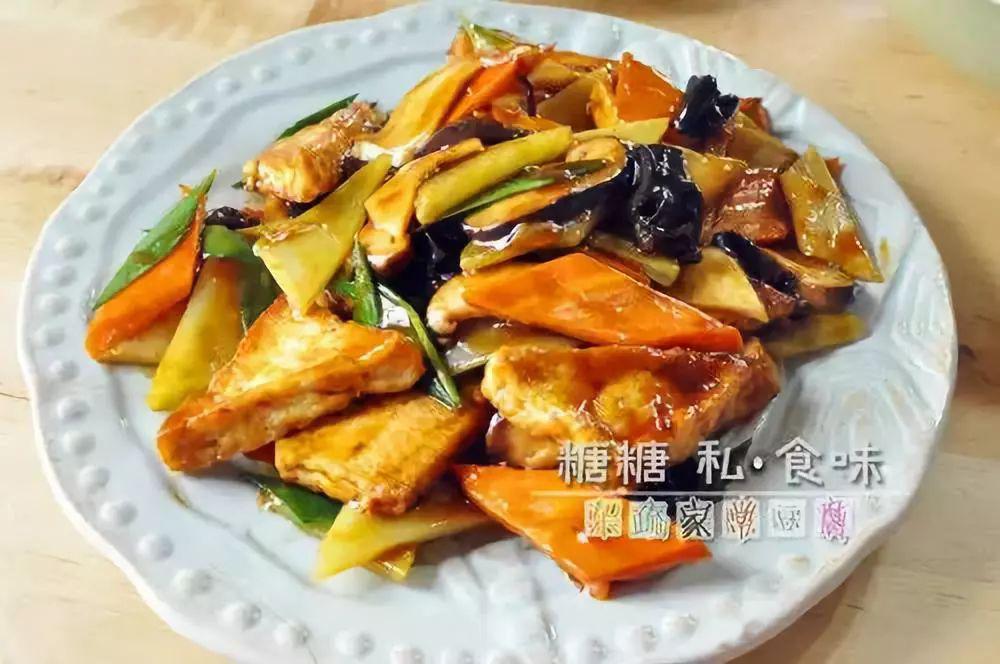 自制豆腐1块、胡萝卜、莴笋、黑木耳、香菇、杏鲍菇、生抽、盐、淀粉