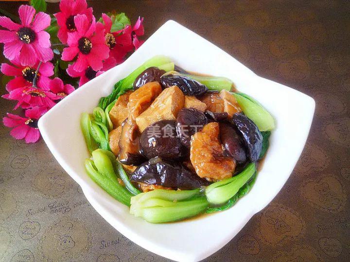 1、干香菇用冷水泡发,胡萝卜去皮切丁,韧豆腐切成小块。