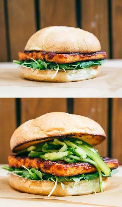 用煎得金黄、外脆里嫩的豆腐块代替肉块做的汉堡。