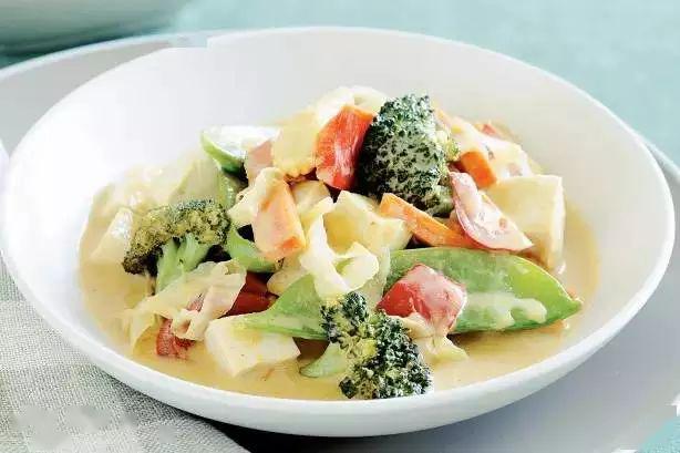 豆腐、西兰花、红萝卜、荷兰豆、咖喱、椰汁
