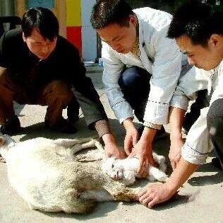 某天上午9时30分,浙江省金华市江南兰溪街一家名叫“九峰菜馆”的店前发生了一幕非常令人感动的情景:店老板戴增荣正准备宰杀一只母山羊时,这只母山羊突然大叫一声“咩”,紧接着两眼中就留下了眼泪,然后出现的情景是他万万没有想到的:这只母山羊后腿突然岔开蹲下,就一眨眼工夫,二只活生生的小羊落在了地上......“我差点害了三条生命!万幸!万幸!”店老板戴增荣连连感叹道。原来,这只母山羊和另外三只山羊是他在两天前从老家汤溪九峰山下的一个村里买来的,因为店里生意比较好,每天要卖掉一只羊。说来也真奇怪,本来前天是要杀这只母山羊的,结果店伙计在抓羊时抓错了羊,所以它侥幸躲过了那一劫。昨天,店老板戴增荣亲自动手,再次抓住了它,没想到就出现了这一幕。