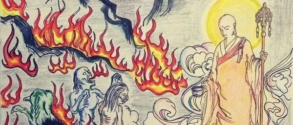 一日,目犍连尊者以神通到饿鬼界的对亚山林,见一身燃大火的饿鬼。它跑到草原时,被业力显现的狮子、老虎、熊、豹等追咬争食,痛苦难忍;躲进大海里,又被业力显现的铁嘴大鱼啃食骨肉;无可奈何飞到空中时,又为业力显现的铁嘴老鹰、乌鸦争相啄食,难以安忍,它四处乱跑,处处遭害。
