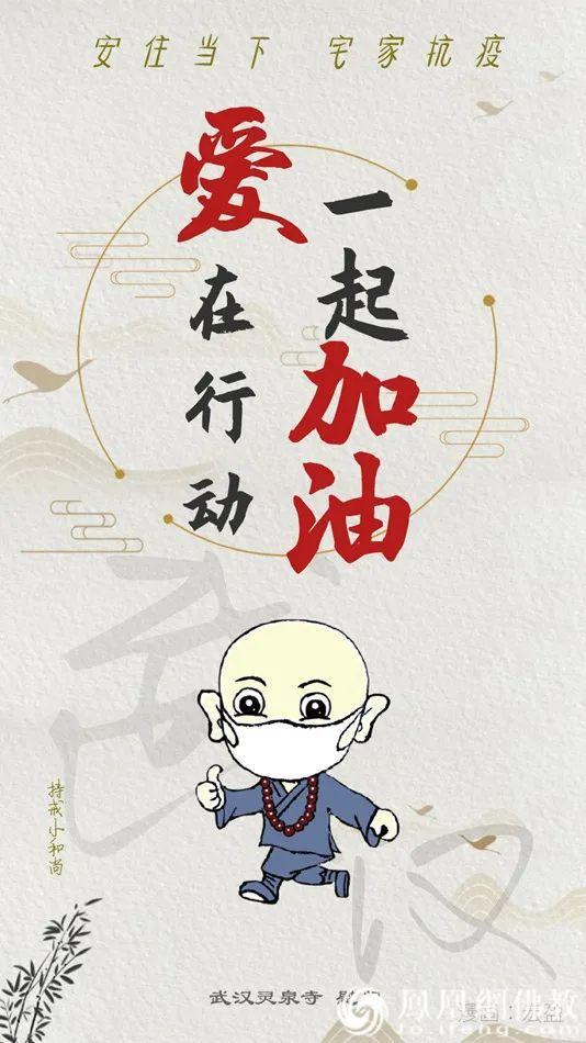 成都大慈寺的张世红居士和武汉灵泉寺的宏盈法师还为捐赠活动创作了漫画和主题人物——“圆一”和“持戒”小和尚。来自四川的“圆一”怀抱着可爱的熊猫,挥舞着“武汉加油!这一路很难,我们陪你走过!”的旗帜为武汉人民加油打气。戴着口罩的“持戒”配上“爱在行动,一起加油“的字眼,温暖了人心,鼓舞了士气。