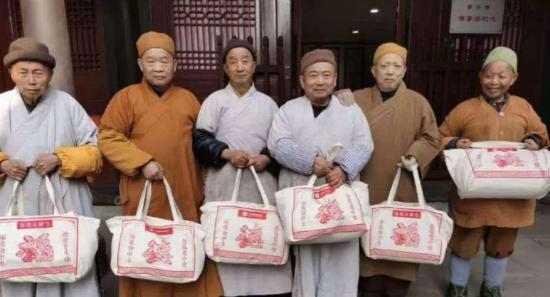 疫情中, 法师们向当地老人发放物资(图片来源:灵山慈善基金会)