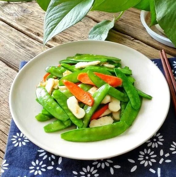 1. 荷兰豆去头尾,丝络,洗净;马蹄去皮洗净;胡萝卜洗净