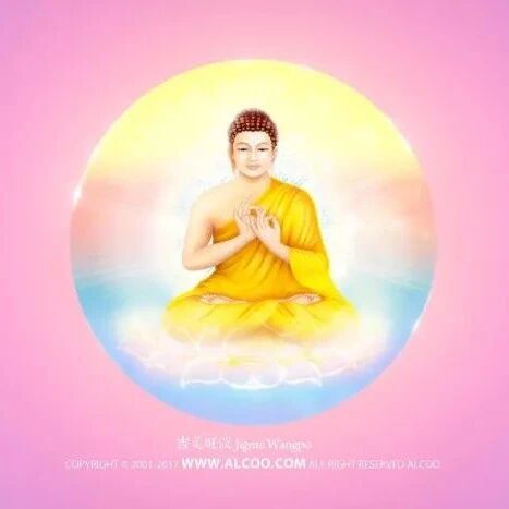 有一尊佛菩萨出现在我眼前,结跏趺坐于莲花台,穿的衣服我不会用语言形容,但是他手中的托钵金光闪闪、五颜六色,尤其是紫色的像水晶一般闪闪发光,我感觉好熟悉,心想他一定就是我每天抄写经书中的僧伽吒。