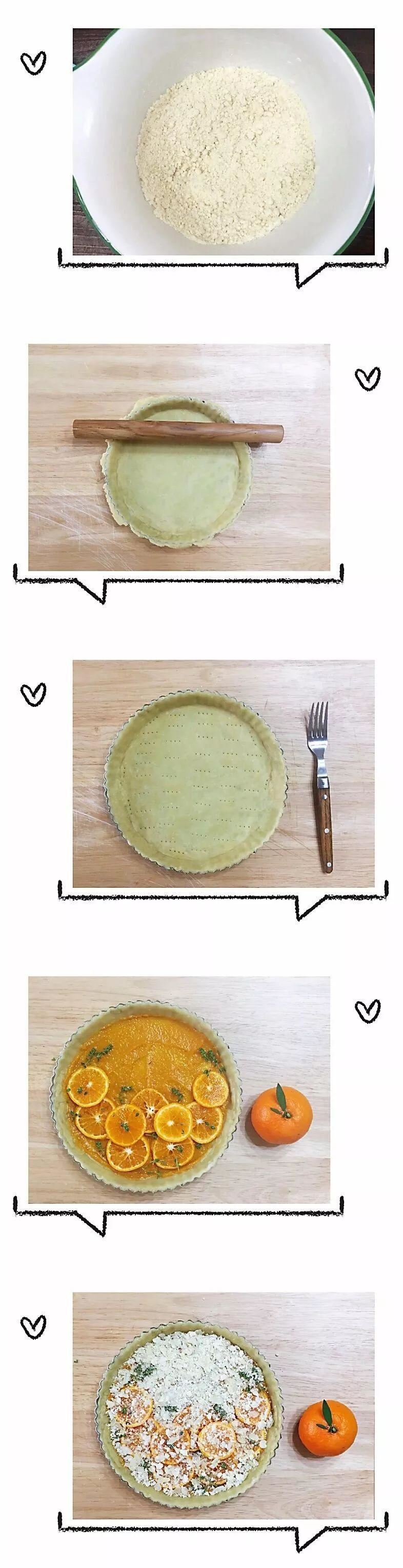 6 派皮上抹一层沃柑酱,然后摆上切好的沃柑片,可以再装饰一点百里香香草碎(下图4)