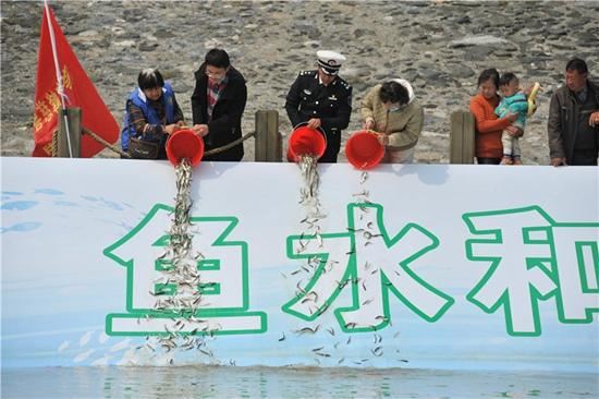 本次放鱼节启动仪式现场放流鲢、鳙、草、鲂、细鳞斜颌鲴、长吻鮠、鳜鱼、河蟹等苗种1万多尾(只)(图片来源:凤凰网佛教 摄影:季利)