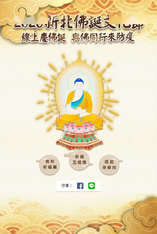 因疫情尚未获得稳定控制,台湾新北市慈法禅寺的佛诞文化节,改以“在线庆佛诞”的方式进行,民众既能网上祝祷洗涤心灵,也能为一线防疫人员祈福。“在线庆佛诞”有三大主题,设计了多项有趣的活动,包含“祈福五灯奖”——为亲友祝福点灯;“吉祥祈福签”——得到药师佛十二大愿的祝福;“疫起来修持”——具祈福及灾疫止息的概念,希望能聚集善能量让疫情早日平息。