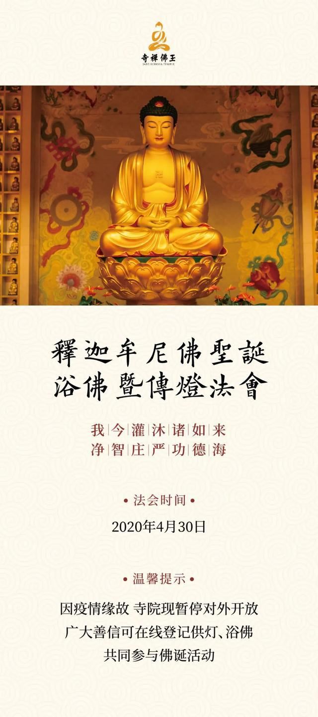 今年佛诞,上海玉佛禅寺将以安全简洁、清净感恩且符合疫情防控要求的方式,在释迦牟尼佛圣诞吉日,举行系列祝圣活动。因疫情缘故,上海玉佛禅寺暂不开放,但广大善信可通过在线报名通道,以网上供灯、浴佛的方式,参与上海玉佛禅寺佛诞活动。此外,大家还可以通过“祝圣普佛 · 文疏通名、供大莲花灯”、“供大莲花灯”、“供小莲花灯”三种方式,线上参与上海玉佛禅寺佛诞浴佛传灯法会。