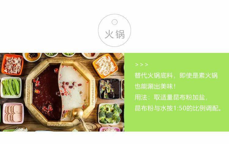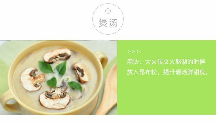 昆布粉由纯天然健康食材提炼,可以融入各种食材,在高温烹饪条件下不容易发生变质,充分促使食物分解自身氨基酸,让食物更加鲜甜可口,让你秒变厨房达人!