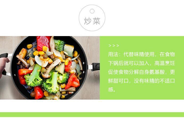 纯天然无添加,可以替代鸡精味精,使蔬果烹煮后滑嫩光亮色,提鲜效果也非常的好。请放心食用!