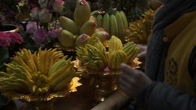 法会期间,为了摆出漂亮的供盘,护法们一丝不苟犹如创作一件艺术品那样认真,有时摆到午夜甚至更晚。