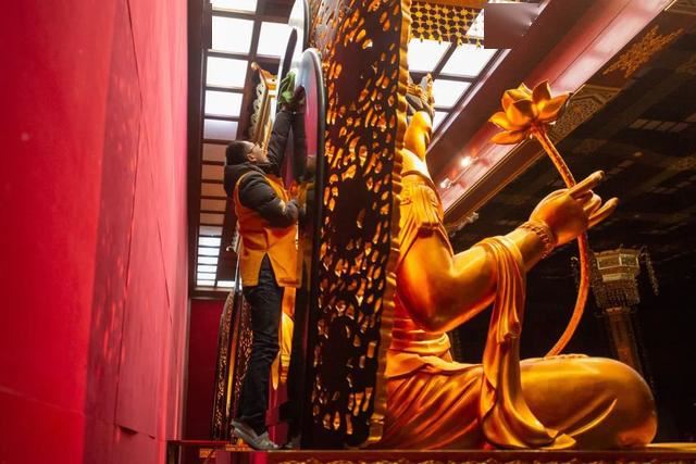 三点过后,义工们陆陆续续过来干活。擦佛台、擦供桌、上供水、摆供果、擦窗户、擦柱子、拖地……看似简单的清洁工作,做起来也很有讲究。