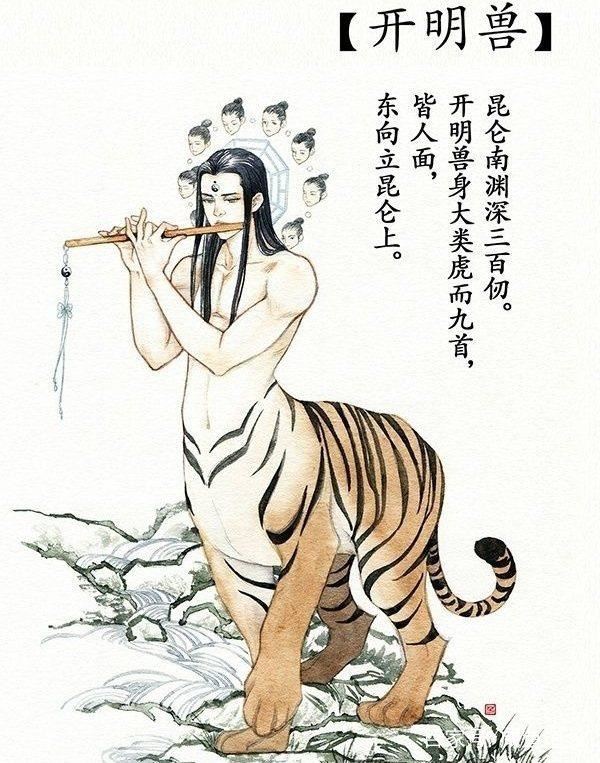 【译文】昆仑山南边的深渊深达三百仞。开明兽的大小与虎相似,有九个脑袋,每个脑袋上都长着人一样的脸,面向东站立在昆仑山上。