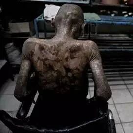 如果不是亲眼所见,很难想象一个人居然可以瘦到这种程度,从手臂到胸口,乃至大腿小腿,身体每个地方都在溃烂。