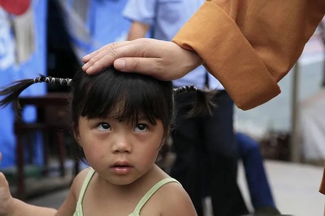 图为2008年6月21日,河北柏林禅寺方丈明海法师到重灾区捐物资时,为当地儿童加持祈福。