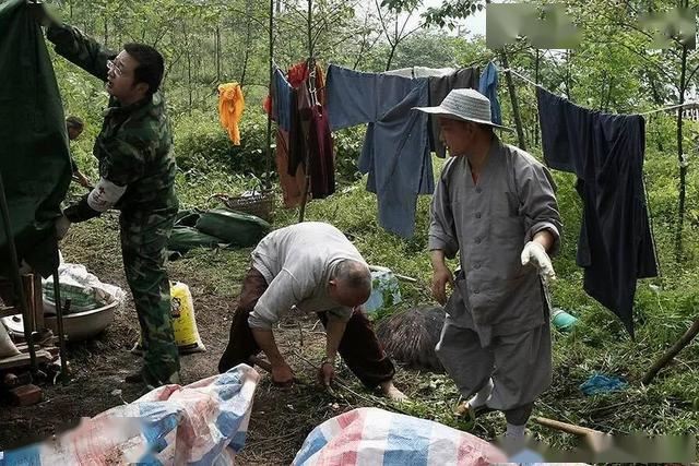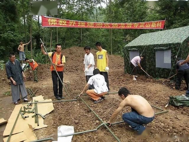 2008年5月16日,素全法师在极重灾区什邡蓥华镇山区帮助受灾寺院及当地村民搭建帐篷。