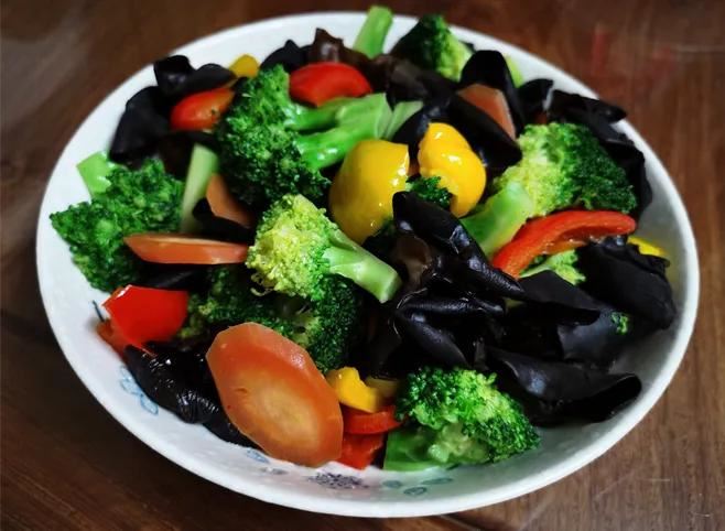 1、西兰花洗净切成小朵,木耳撕成小朵,黄红椒切片,胡萝卜切片,备用;