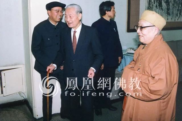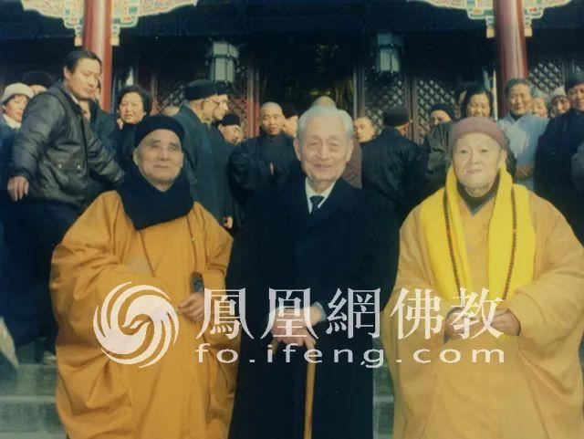 图为1993年,赵朴初居士与原中国佛教协会副会长茗山法师、原中国佛教协会咨议委员会副主席慈舟法师在镇江金山寺。