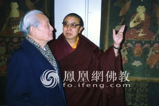 图为1991年1月,赵朴初与却西活佛在一起参观藏族唐卡艺术。