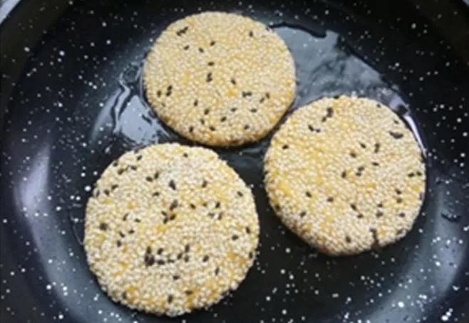 7、煎锅里倒少许油,放入南瓜饼煎至两面金黄色,全程中小火;