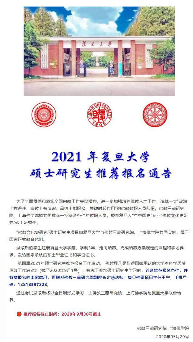 2020年5月29号,佛教三藏研究院 上海佛学院发布2021年复旦大学硕士研究生推荐报名通告,通告显示,录取后的学生注册复旦大学学籍,学制3年,定向培养。完成培养方案规定的课程和学习要求,发给国家承认的硕士毕业证书和学位证书。报名通告如下: