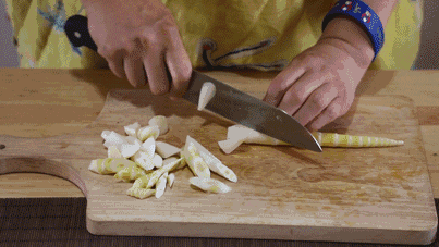 2、竹笋滚刀切块(过了春笋的季节,冬笋又未到,可小主实在想吃,所以就买的超市真空包装的春笋),香菇洗干净切方块。