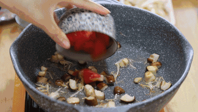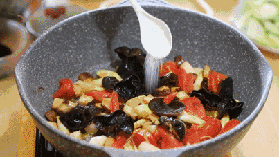 5、待香菇煎至微微变色,下入西红柿,继续加入竹笋、泡发黑木耳。