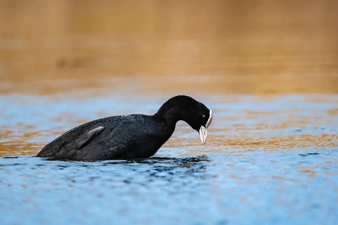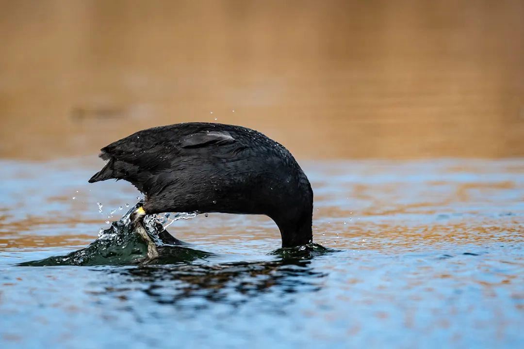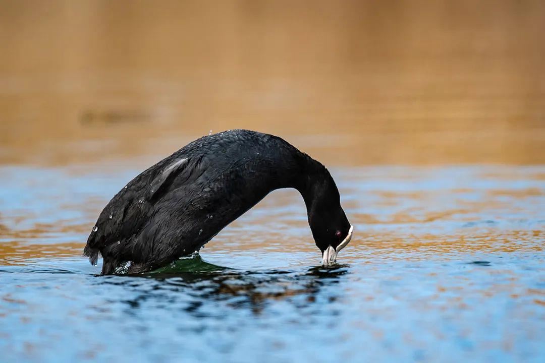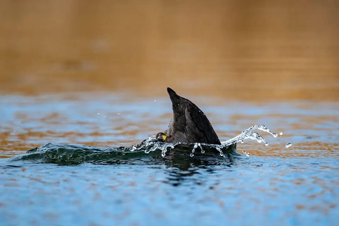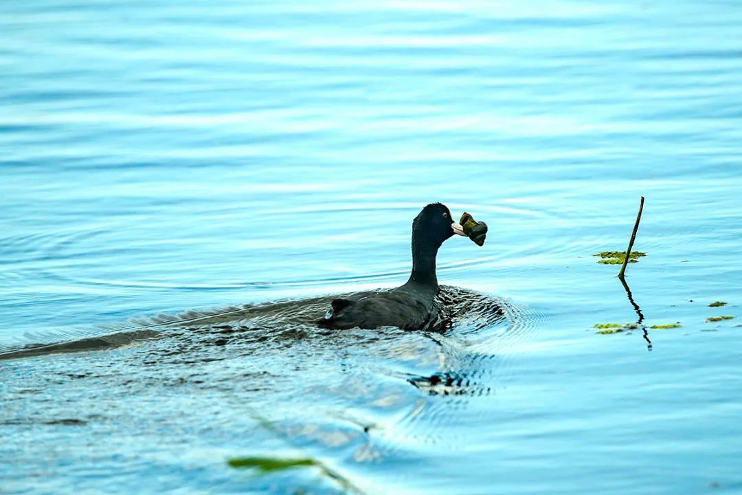 骨顶鸡还是很有心计的,比如觅食的地方水较深,它们就会跟随体型大的觅食鸟,投机取巧省去反复潜水觅食。