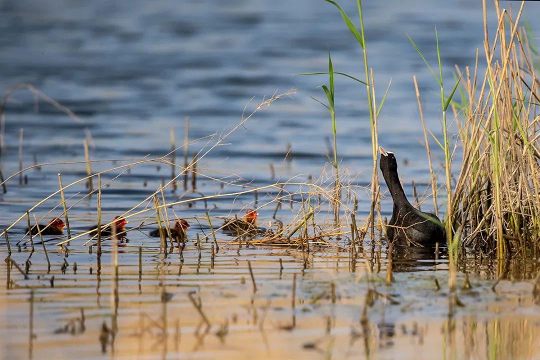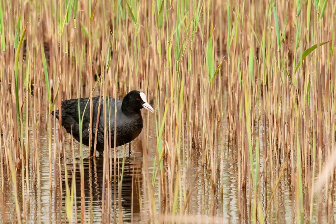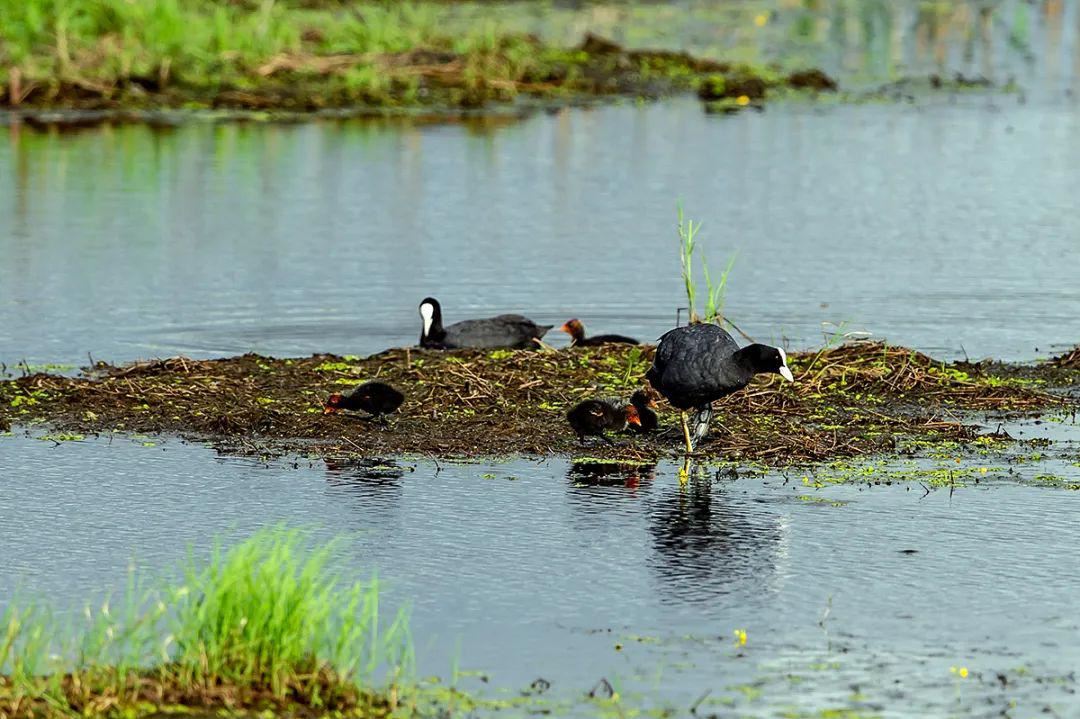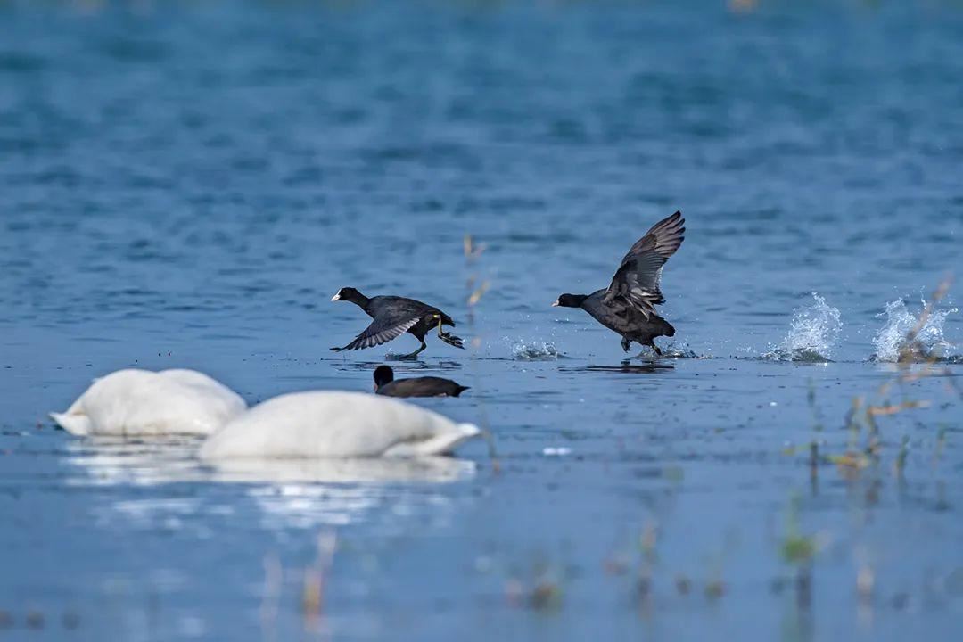 欺软怕硬在骨顶鸡这里表现的淋漓尽致。比如,骨顶鸡侵占了白翅浮鸥的喂雏场地,但不惧攻击驱赶,就是不走;而进入黑颈䴙䴘的巢区时,被体型小很多且极其强硬的主人驱赶,却选择了逃避。