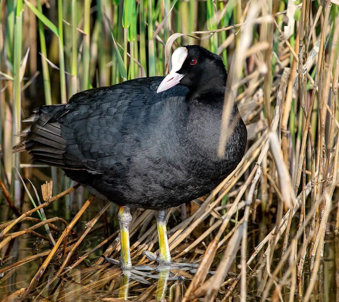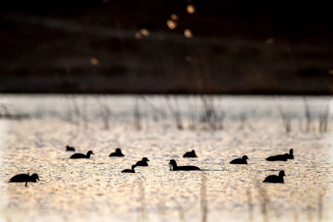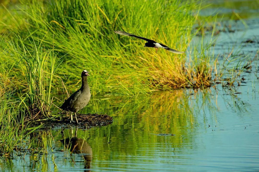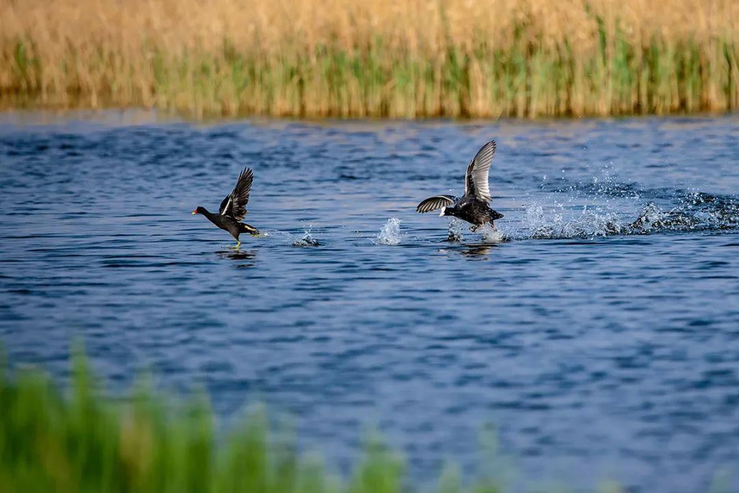 欺软怕硬在骨顶鸡这里表现的淋漓尽致。比如,骨顶鸡侵占了白翅浮鸥的喂雏场地,但不惧攻击驱赶,就是不走;而进入黑颈䴙䴘的巢区时,被体型小很多且极其强硬的主人驱赶,却选择了逃避。
