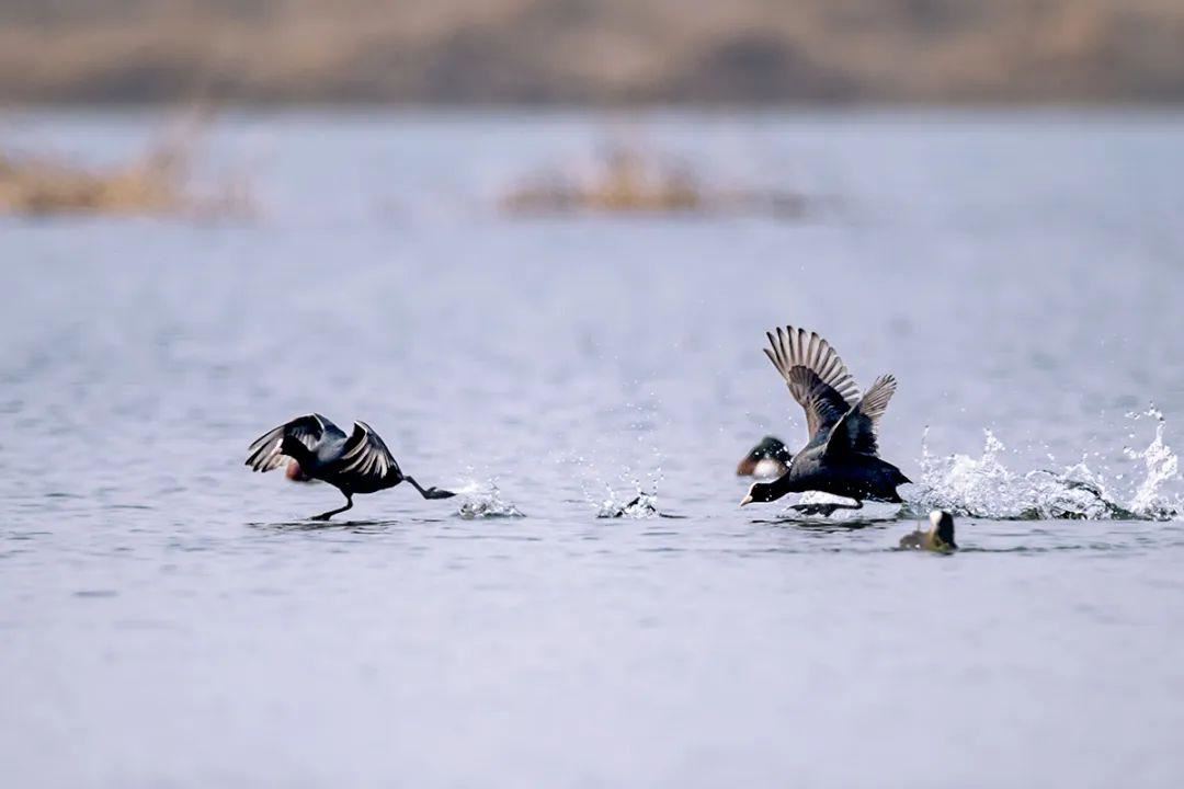 骨顶鸡虽然看起来憨大黑粗、没心没肺,实际上是个好斗的主。观察发现,同类之间打斗只是追逐逃跑,但不会像有的鸟种一旦打起来就你死我活。