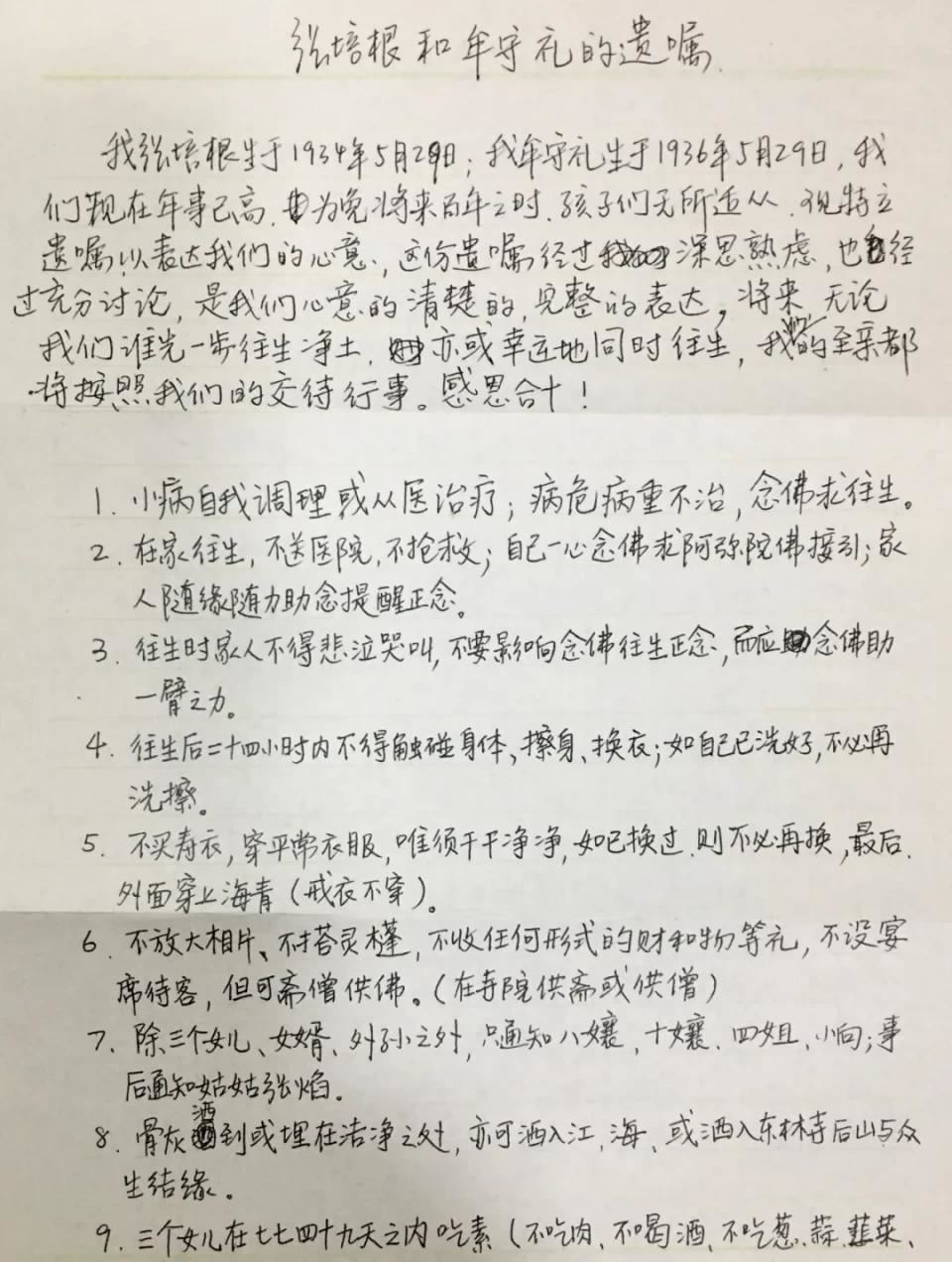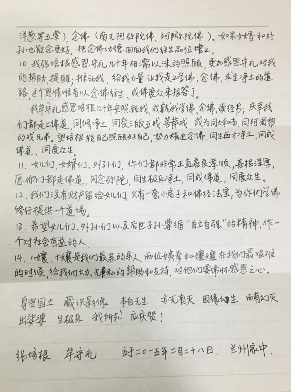 最后,我想截取张培根居士和牟守礼居士的遗嘱中的一段作为本文的结尾: