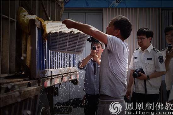 义工等待运输鱼苗(图片来源:凤凰网佛教 摄影:季利)