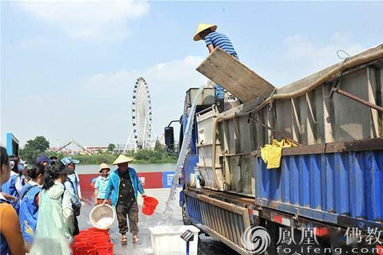义工们耳听口令一起放流(图片来源:凤凰网佛教 摄影:季利)