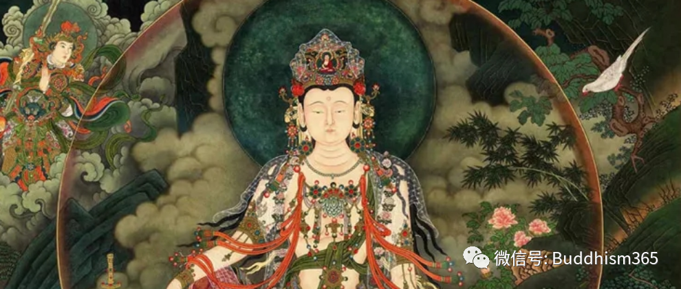 四大天王各以种种微妙璎珞。庄严其身。以妙天冠庄严其首。垂诸璎珞。复共无量干闼婆众鸠盘茶众诸龙夜叉。无量百千。左右围繞。身带种种坚牢铠甲。手执弓箭。或执利剑。或执长刀。或执铁棒。或执矛戟。或执三叉。执槊执钩。擎持排楯。在太子前。引导而行。语太子言。大圣太子。从于此道。速行莫住。上虚空中。复有无量无边诸天百千亿众。欢喜踊跃。遍满其身。不能自胜。将天水陆所生之花。散太子上。并及旃檀诸妙沈水多伽罗等天诸末香。自余更有种种杂香。散太子上。复有涂香末香烧香。太子行时。各各手持散太子上。以用供养于太子故