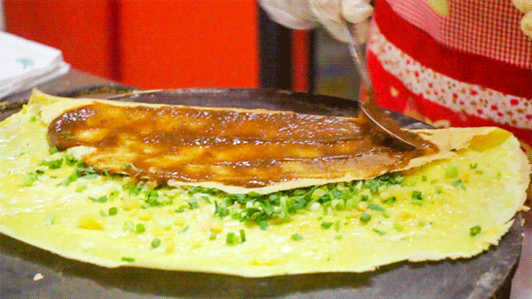 薄薄的一片小麦煎饼, 裹上生菜、黄瓜、土豆, 再刷上酱料, 从中切开,叠在一起, 一口咬下,满足! 纯素的朋友, 记得说一声 “ 不加蛋 ” 哦!