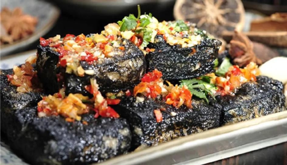 臭豆腐是中国传统特色小吃, 各地的制作方式有相当大的差异, 有北方和 南方的不同类型, 古老而传统,令人欲罢不能, 制作材料有大豆、豆豉、纯碱等, 最为出名的是长沙和南京的臭豆腐, 呈色墨黑、外焦里嫩、鲜香麻辣, 初闻臭气扑鼻,细嗅浓香诱人。