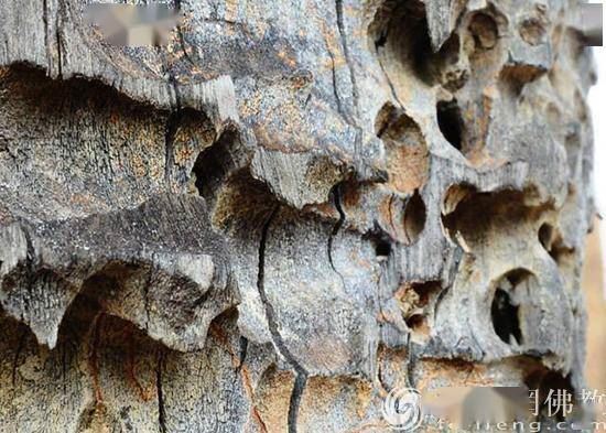 从海洋挖起的乌木,布满贝类啮食的孔洞。(图片来源:凤凰网佛教 桐柏山木雕博物馆提供)