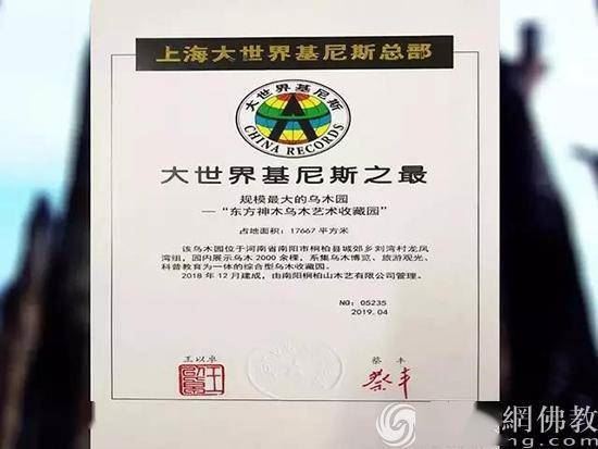 乌木园“大世界基尼斯之最”证书(图片来源:凤凰网佛教 桐柏山木雕博物馆提供)