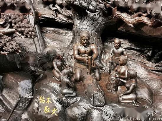 “中华上下五千年”巨型雕刻局部:钻木取火(图片来源:凤凰网佛教 桐柏山木雕博物馆提供)
