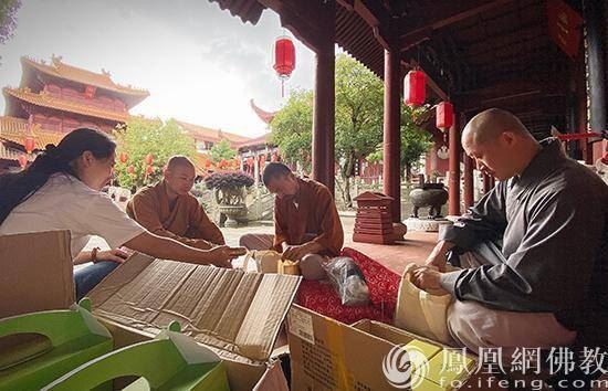 宁德市古田县佛教协会会长定空法师分装端物礼包(图片来源:凤凰网佛教)