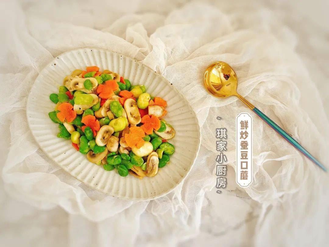 1. 蚕豆剥去外皮,口蘑切薄片,胡萝卜改刀;