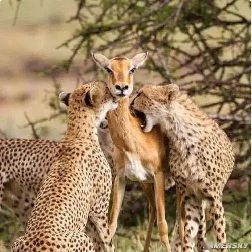 图片中的三只猎豹追捕一只母鹿和两个鹿宝宝,以母鹿的奔跑速度可以轻松逃掉这场杀戮。